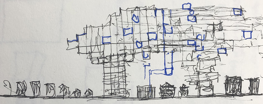 We took our model of SoBro, the little slice of downtown where Luckett & Farley has kept its offices for over 50 years, and let it act as a tool to prompt our thinking. We chose an innocuous and hazy material and began to project a new tier, a new city, on top of the one we know and work in every day.